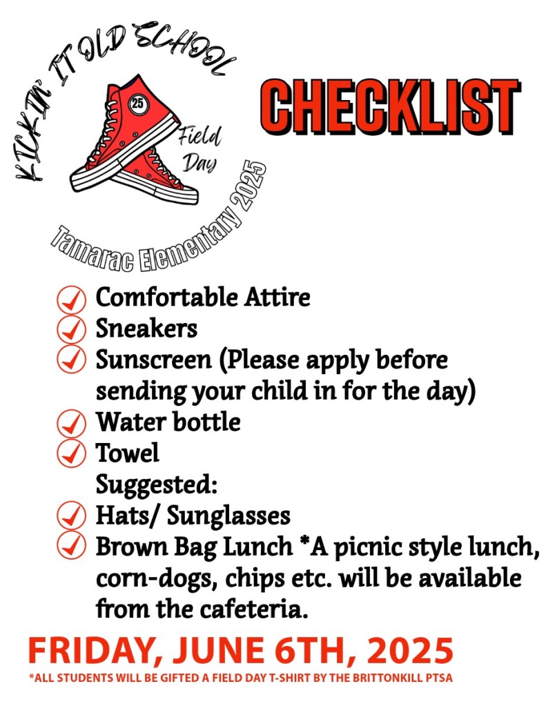 Elementary Field Day will be Friday, June 6, 2025. Don’t forget to send your kids to school with these essentials!