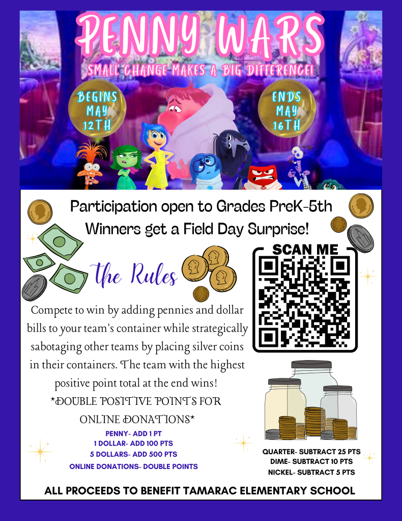 Grades/Teams will compete to win by adding pennies and dollar bills to their team’s container while strategically sabotaging other teams by placing silver coins in their containers. The team with the highest positive point total at the end wins!